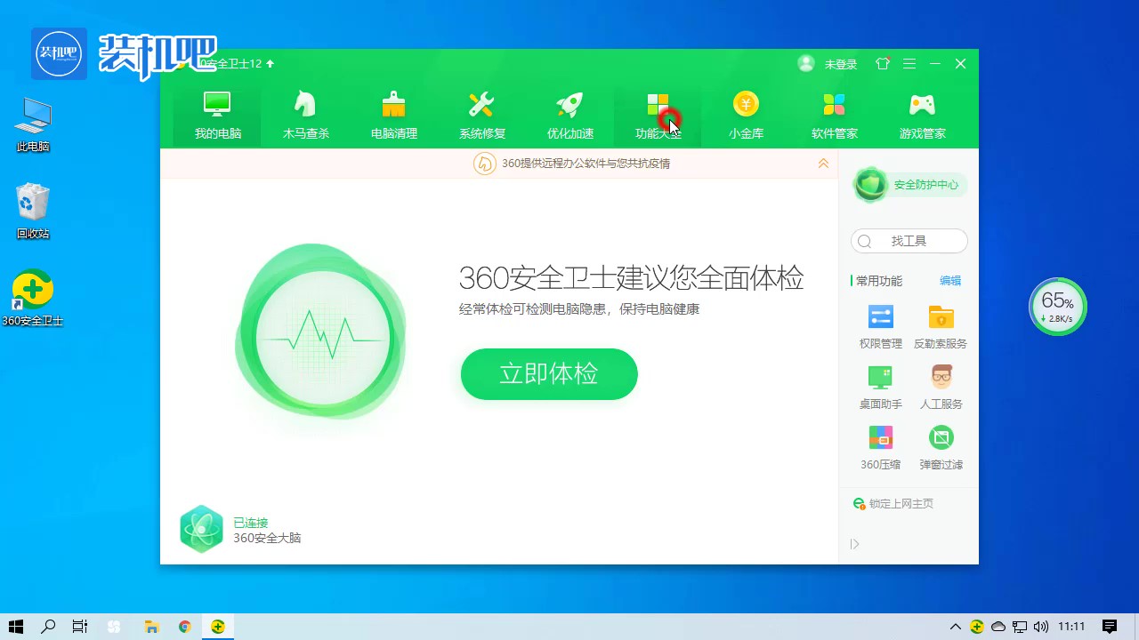 1、下载并打开360安全卫士,点击上方的【功能大全】。