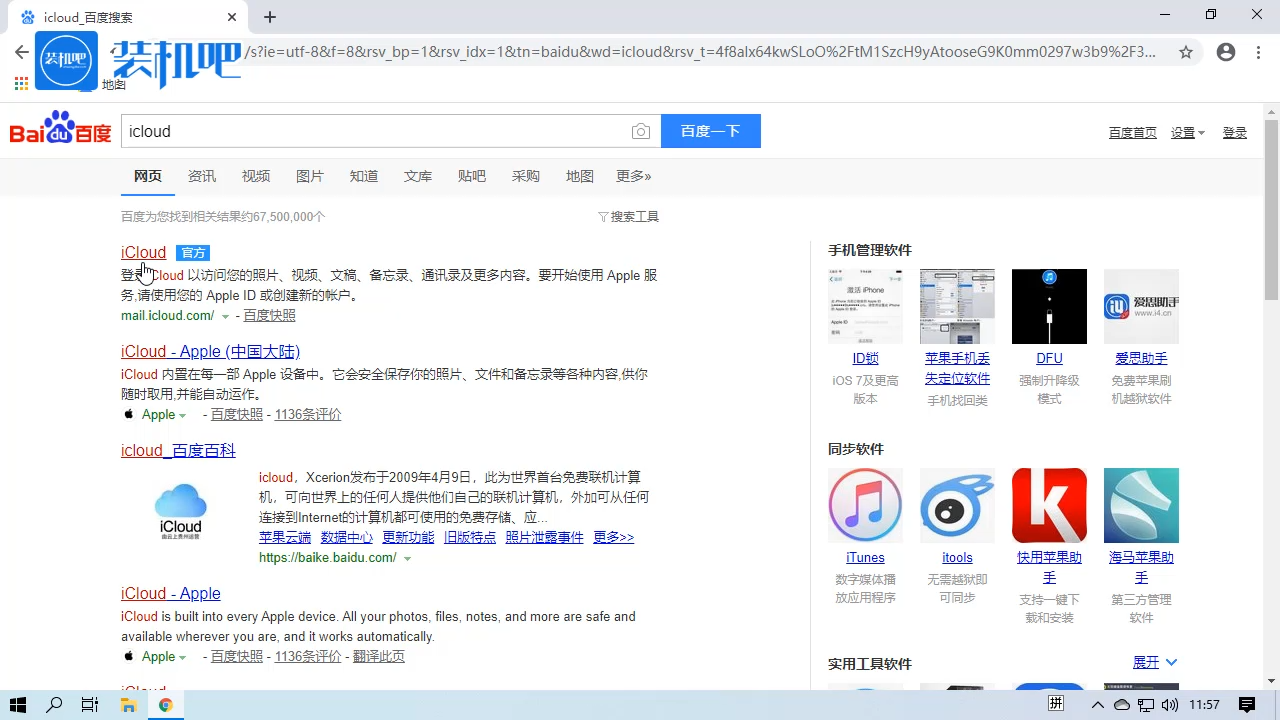1、打开百度,搜索“icloud”,点击进入官网。