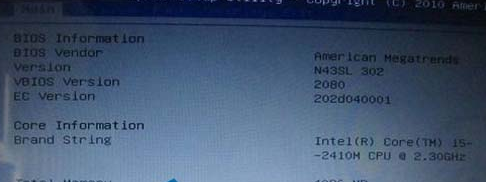 1、首先把已经制作好启动盘的u盘插入电脑usb插口,然后开机,待开机画面出现以后连续按下“F2”进入BIOS设置主界面。如下图所示:(显示的是首先进入bios设置看到的main选项界面,该页面显示的是华硕N43EI241SL笔记本的基本信息)。
