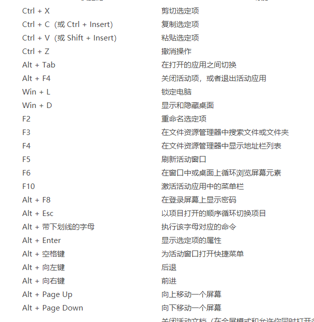 | Alt + F4 | 关闭活动项,或者退出活动应用 |