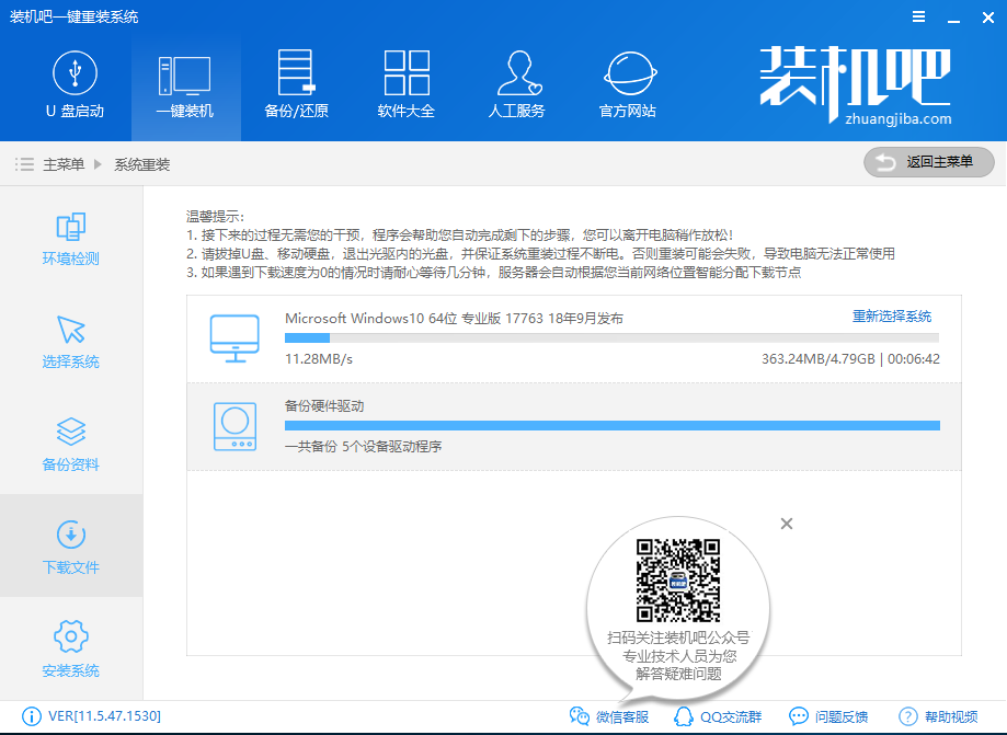 5.然后装机吧软件会自动开始下载win10系统并做相应的备份工作。