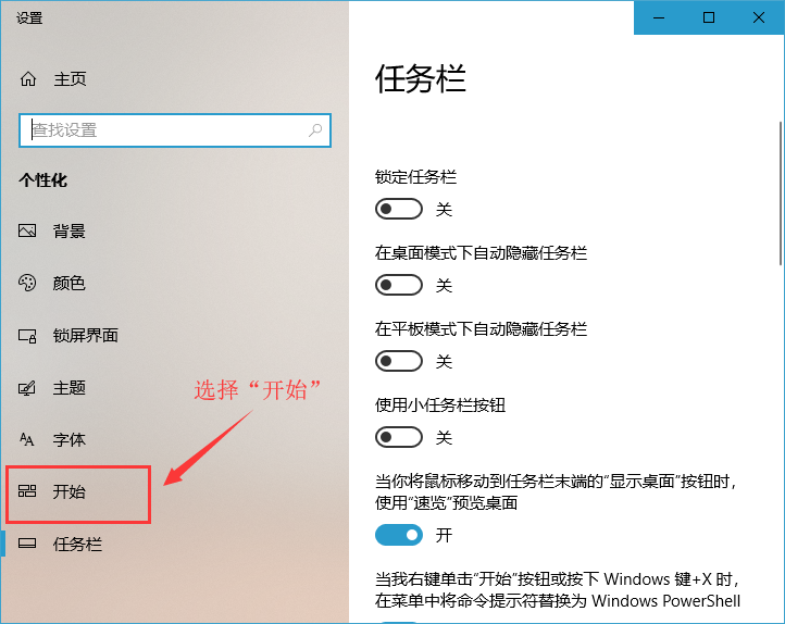2、而后在设置中我们左侧选择到“开始”的个性化设置中;
