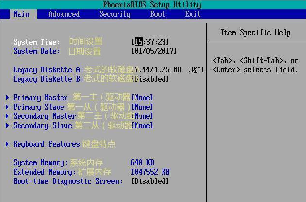 Main菜单:这里记录着电脑的主要信息,比如时间和日期,软盘现在已经不再使用,下面的驱动器中会记录电脑连接的硬盘信息,扩展内存就是电脑的物理内存大小,1024KB=1MB,1024MB=1GB。