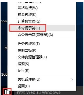 1、进入win10系统后,右键点击开始按钮,点击“命令提示符”。