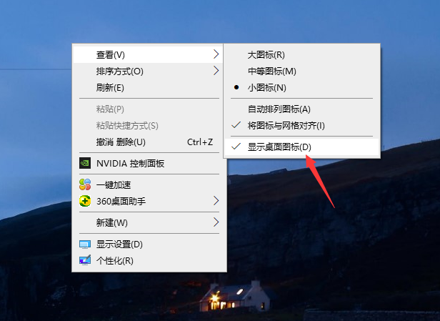 1、对着桌面空白处单击鼠标右键,在菜单中鼠标指向“查看”,然后点击菜单中的“显示桌面图标”。