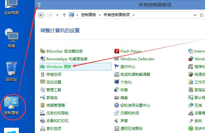 1、双击Win10系统桌面上的控制面板,在查看方式为小图标下,找到Win10更新升级的入口。点击Windows 更新进入。如下图所示。