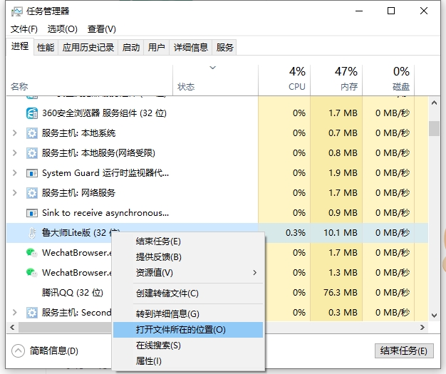 1、电脑出现弹窗广告时先不要急着关闭,按下快捷键Ctrl+alt+delete打开任务管理器。右键点击“进程”下的广告名选择“打开文件所在位置”。