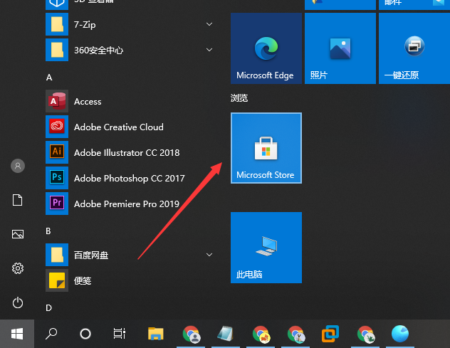 1、首先我们在电脑上点击开始按钮,在弹出菜单中找到并点击Microsoft Store菜单项,或是点击开始菜单中的Microsoft store的磁贴。
