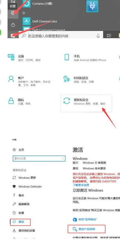 2.我们知道了以上的密钥,我们就可以进行激活了,我们首先打开设置,在进入更新与安全,然后点击激活,然后我们点击更改,输入以上的就可以了。