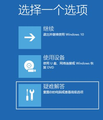 1.首先我们重启电脑三次,直到进入到选择一个选项页面中,选择“疑难解答”功能。