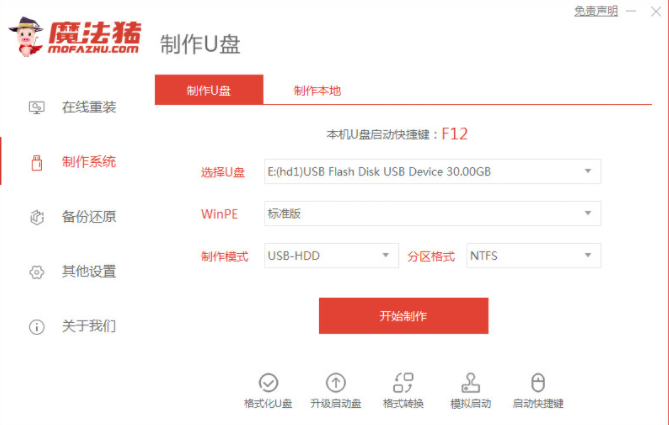 1.首先下载并安装魔法猪一键重装系统工具,在可用电脑上打开,插入8g以上的空白u盘,选择u盘重装系统模式,点击开始制作按钮。