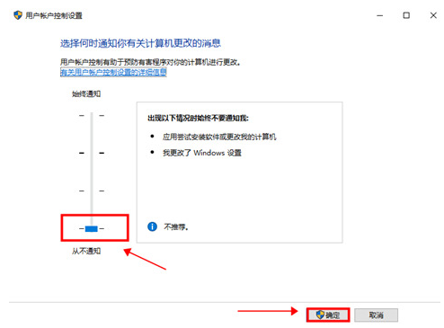 2、进入后,鼠标点击“从不通知”上方位置,将蓝色按钮修改后点击确定即可。