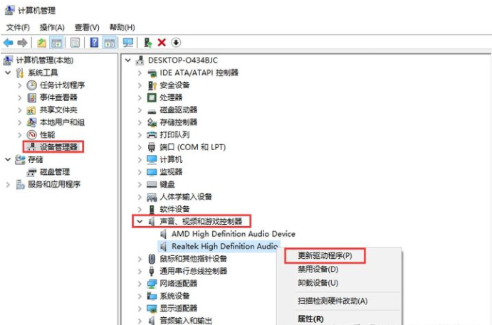直接用鼠标右键单击“此电脑”图标,选择“管理”打开,然后继续点击“设备管理器”,找到“声音、视频和游戏控制器”展开,然后选中声卡设备鼠标右键更新一下最新的驱动程序。