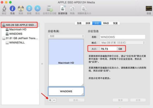 1、进入苹果的桌面当中,在实用工具页面打开【磁盘工具】,我们选择整个硬盘,进行【分区】的操作,可以使用【+】来增大windows分区的容量,完成后点击【应用】即可。