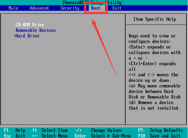 3、此时按住【+】键将选项向上移动到页面的第一个位置上,也就是把【removeble devic】移动到最上面,设置为第一启动项。