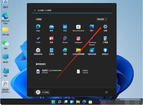 1、首先打开win11系统桌面,然后点击底下的开始菜单图标,选择设置选项进入。