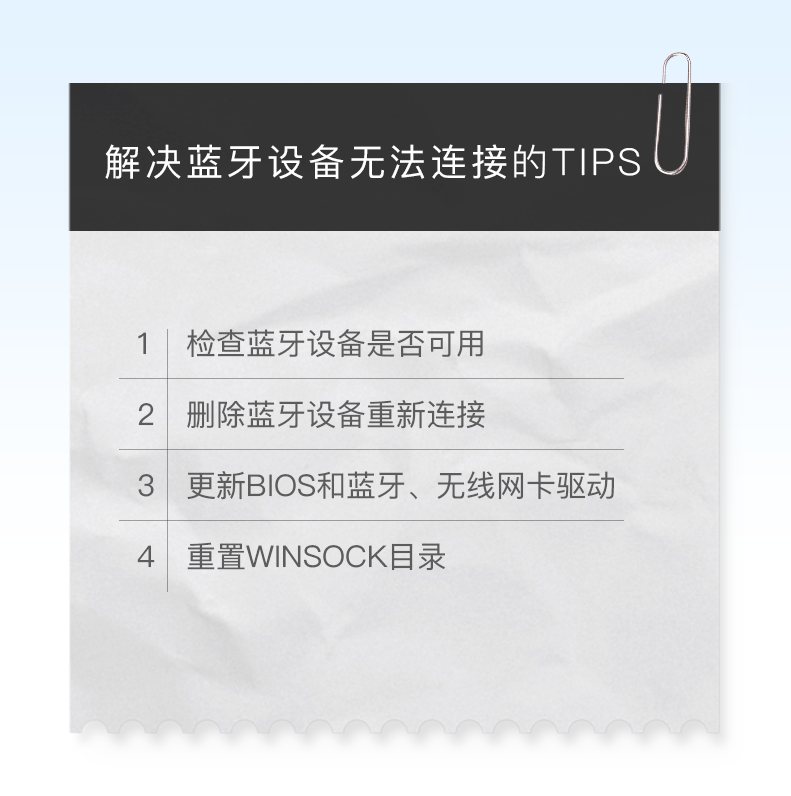 蓝牙设备连接的问题,绝大多数会出在蓝牙设备端,因此首先需要解确认网络环境是否可用:1. 使用蓝牙设备连接其他电脑、手机;2. 使用其他蓝牙设备连接这台电脑;步骤1和2完美组成了一个对向交换测试。