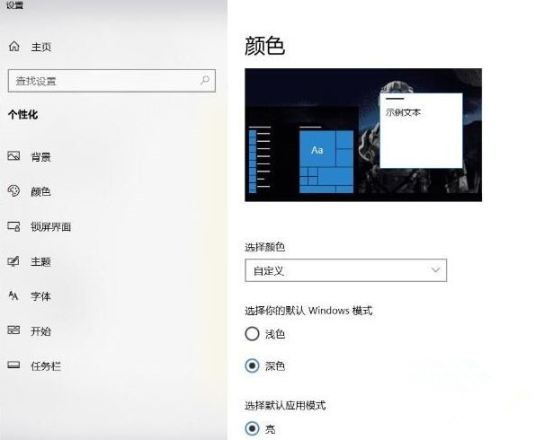 1、桌面鼠标右键点击个性化,颜色>>选择颜色>>选择深色或自定义。自定义可按如下设置
