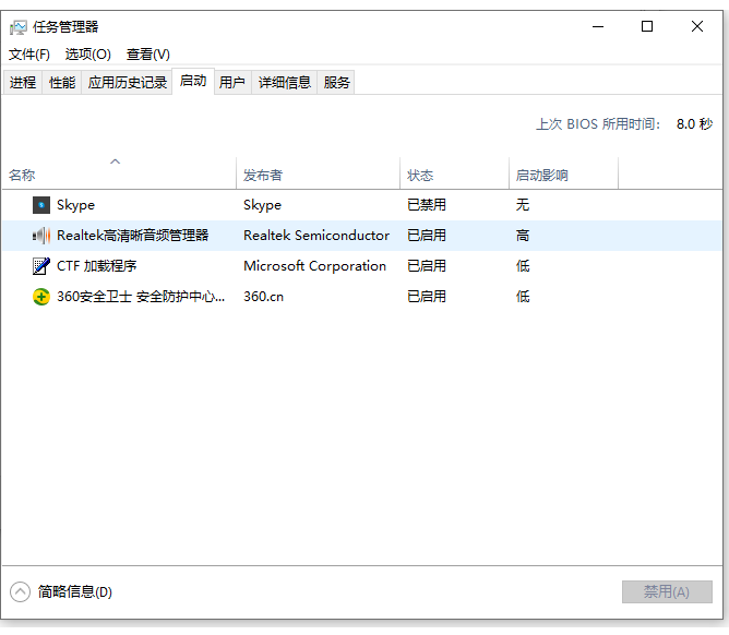 2、在系统配置界面选择启动选项,找到开机自启的软件,点击禁用即可。