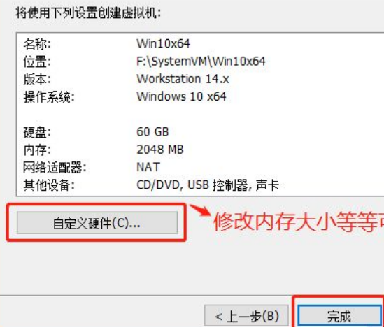 7、如果要修改内存大小、处理器个数,可以点击【自定义硬件】,在弹出窗口中设置即可。如果此时不设置,后续也可以修改的。修改完成后,点击【完成】按钮。