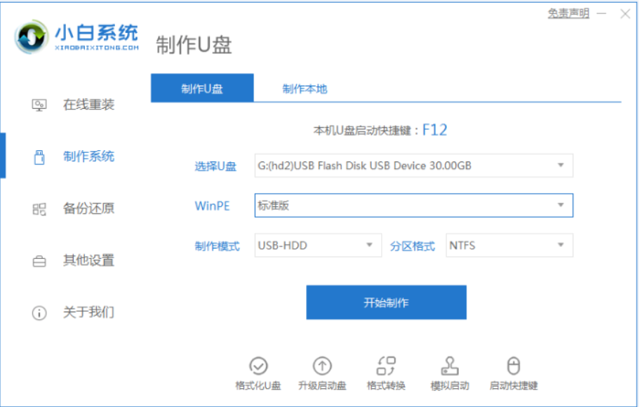 1、先关闭我们电脑上的杀毒软件以防阻止安装步骤,然后打开小白一键重装系统。插入u盘后点击“制作系统”—“开始制作”。