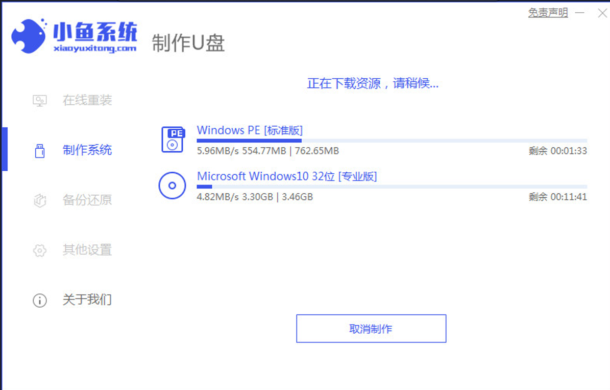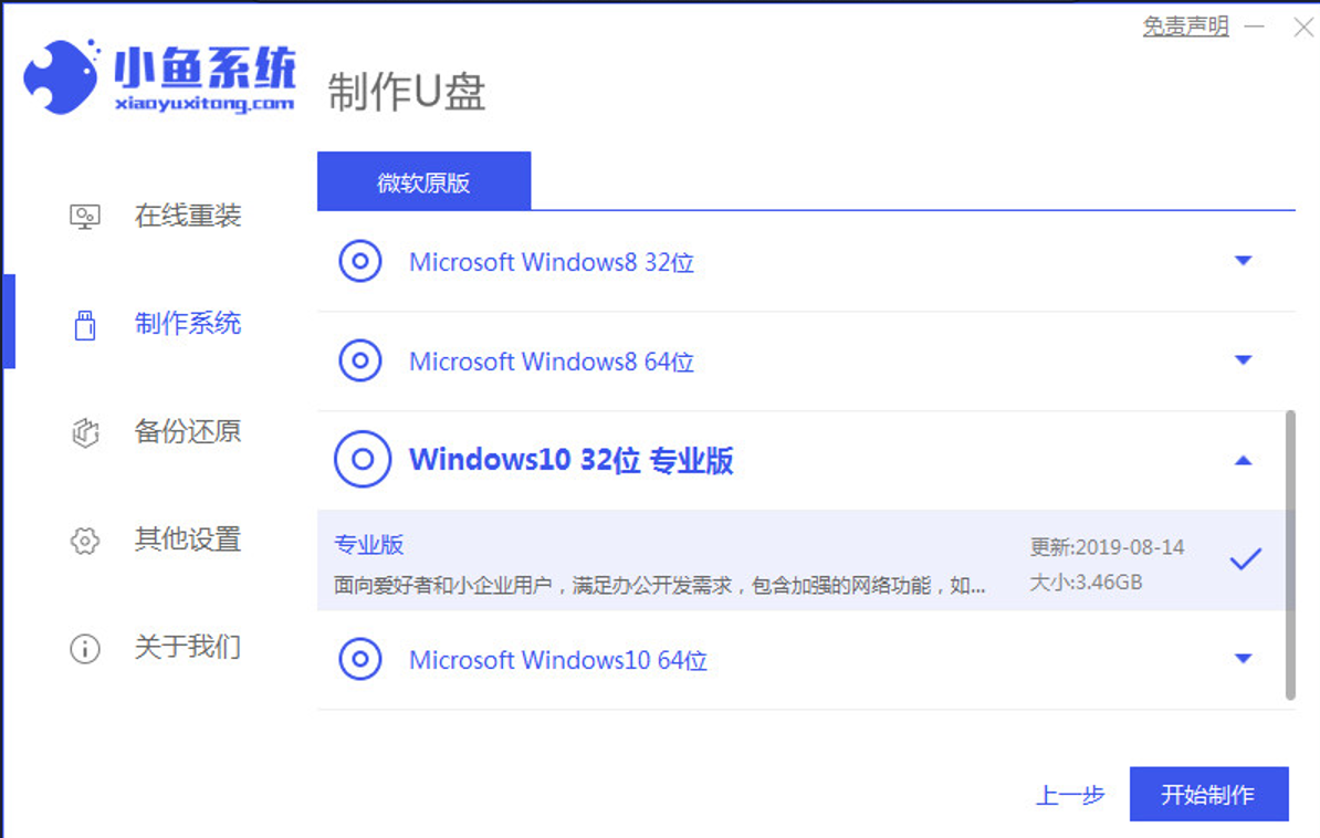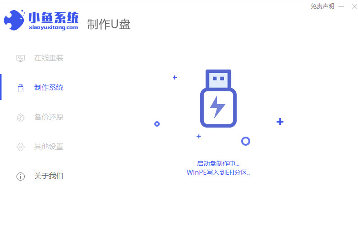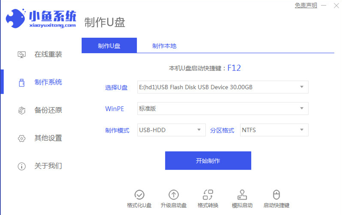 1、在线下载小鱼系统软件,点击左侧制作系统,插入U盘,点击开始制作。