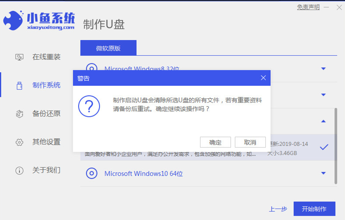 2、选择要下载的win10系统,点击开始制作,制作启动盘前确认已备份好U盘内的资料,点击确定。