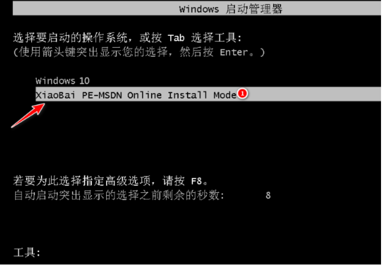 4、重启后进入了开机界面,选择xiaobai-pe系统进入。