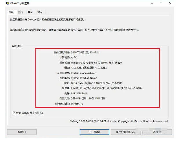 2、进去DirectX诊断工具之后,在系统界面,可以看到当前电脑的基本配置信息,如下图所示: