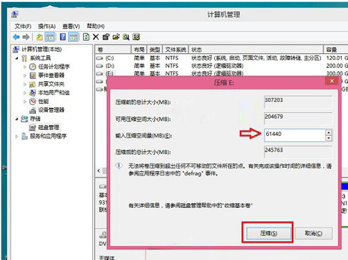 3、在弹出的压缩卷对话框中,需要输入压缩空间大小。由于当前选择的是300G容量的F盘,本身已经使用了20GB,剩余280GB容量可用。这里由于是用作安装Win10系统可用,而Win10安装盘,一般建议需呀40GB以上容量,因此这里给其分配了60GB,也就是60*1024M=61440(M),输入容量后,点击底部的“压缩”即可,如下图所示。关于新建Win7分区大小,大家可以根据自己的实际需求来灵活分配。