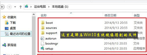 1.将Win10系统镜像解压到I盘根目录后,再将下载的nt6 hdd installer解压后里面的“nt6 hdd installer v3.1.4运行程序”复制到I盘中Win10系统解压目录下,如下图所示。