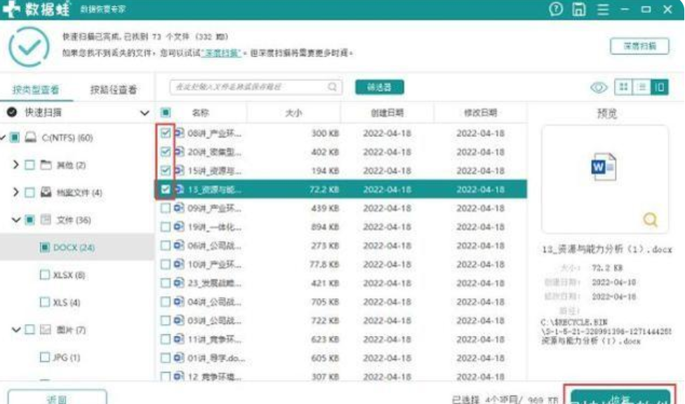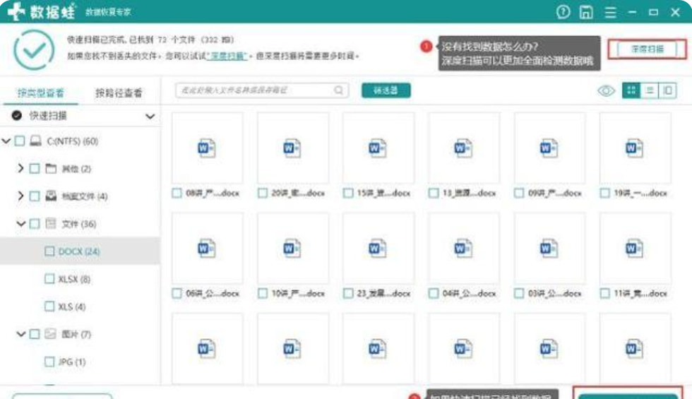 在初次扫描后,可能你会发现没有找到需要的文件。怎么办?不用急,试试软件提供的深度扫描模式,该模式将启动全面扫描功能,不管是电脑删除的和非删除的,都可以检索出来。在扫描的最终结果界面,寻找自己需要的文件,即可恢复。