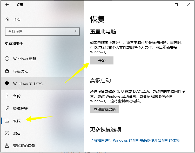2、点击左侧的恢复,然后点击右侧的重置此电脑开始。