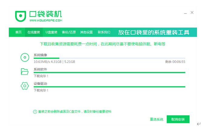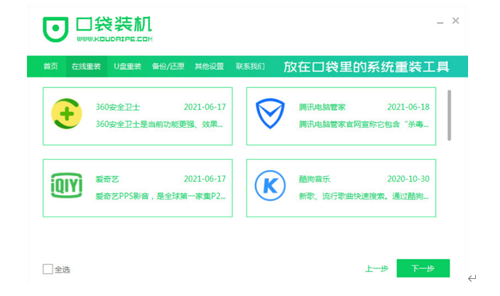 1、下载并运行口袋装机软件,点击在线重装系统。