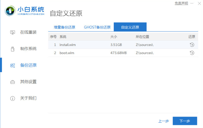 2、打开小白一键重装系统工具并备份还原,勾选自定义还原。