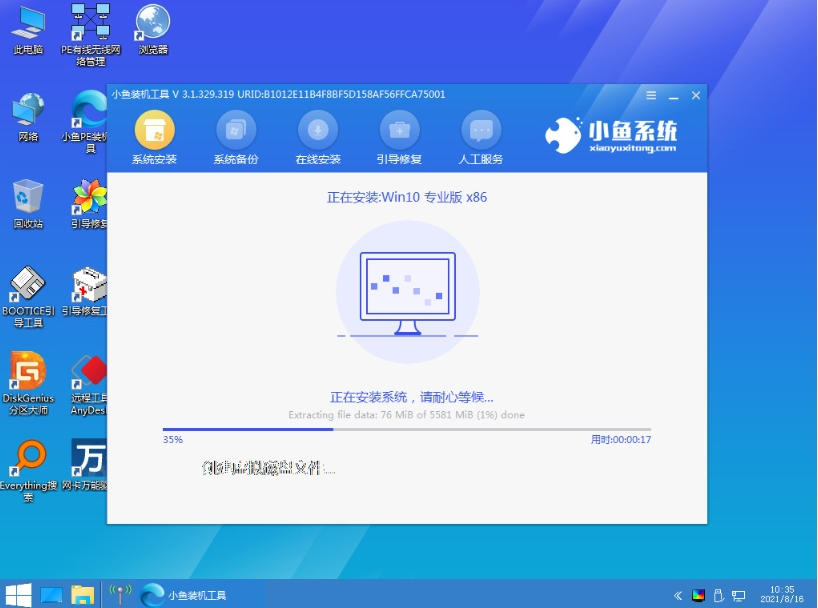 5、来到pe系统内,小鱼装机软件自动安装win10系统。