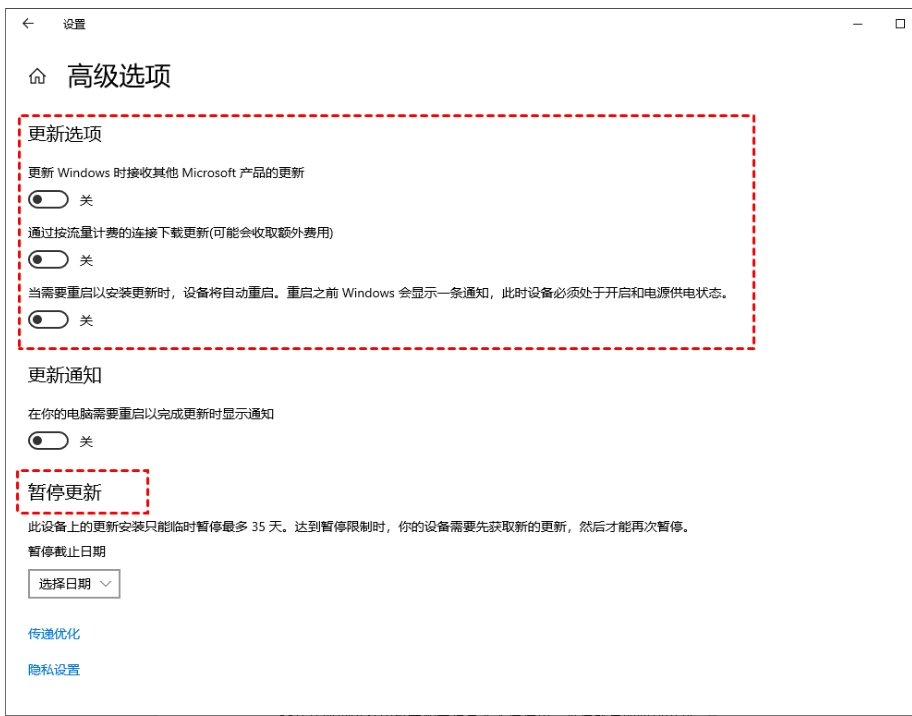3. 在高级选项中,您可以将“更新选项”中项目全部关闭。