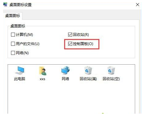 3、进入“桌面图标设置”窗口后,勾选“控制面板”,然后点击确定按钮即可把控制面板添加至桌面,这样便于我们在桌面上随时打开控制面板。