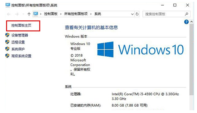 2.进入属性页面后,点击左上方的“控制面板主页”,即可进入到控制面板的页面中。