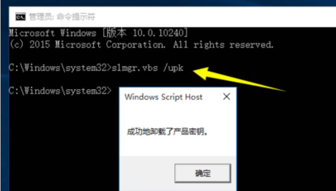 2.在命令提示符的窗口后输入命令:slmgr.vbs /upk,按回车运行,卸载原来的产品激活,即提示“已成功卸载了产品密钥”。