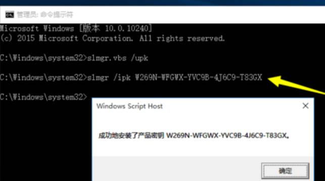 3.接着输入命令:slmgr /ipk W269N-WFGWX-YVC9B-4J6C9-T83GX(此为版本对应的密钥,自己查看并按上面对应选择),接着回车键后会弹出“成功的安装了产品密钥”的提示。