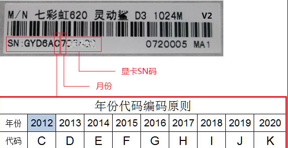 七彩虹显卡的生产日期可以从显卡的SN条码进行查询。SN码第六位是用字母表示的生产年份,年份字母后跟的一个数字是指生产月份。