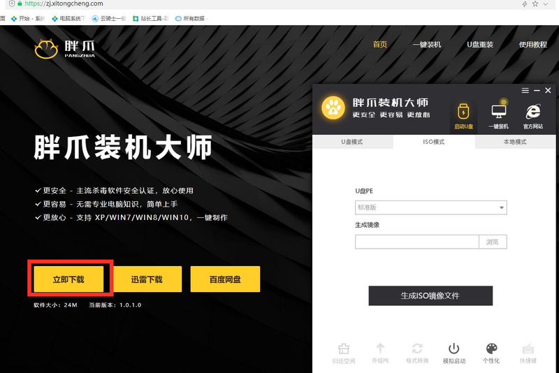 1.首先提前下载好需要的系统iso文件,在网页中输入zj.xitongcheng.com,点击左侧"立即下载"安装胖爪装机大师软件到电脑上。