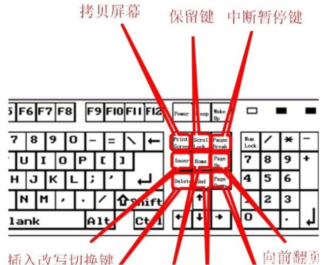 Pause Break叫中断键暂停键;Insert叫插入改写切换键;Delete叫删除键,删除光标后面的内容;Home是定位到行首;