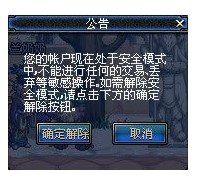 1、进入游戏界面后,如果看见以下提示则表示账号进入了安全模式,需要您验证密保进行解除。