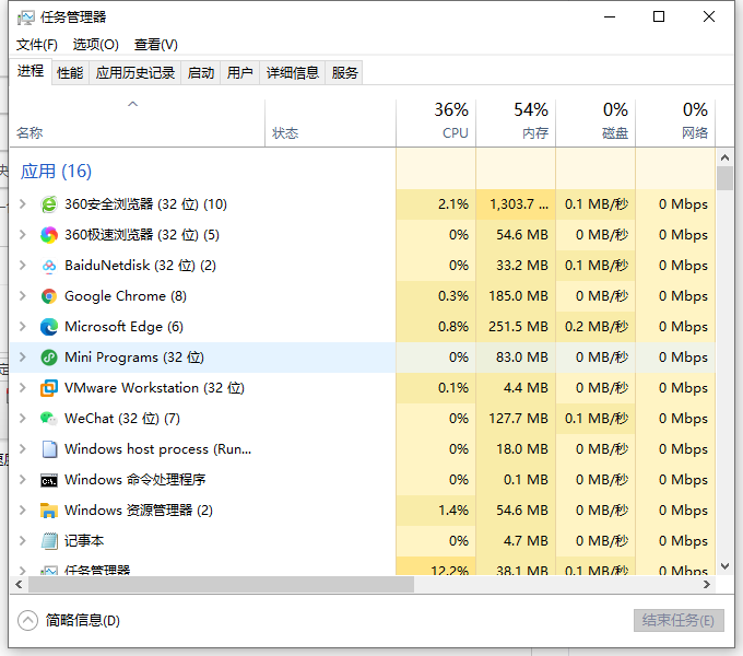 1、使用快捷键【ctrl+shirt+esc】唤出任务管理以后,简单的可以看到哪些在运行占用了。