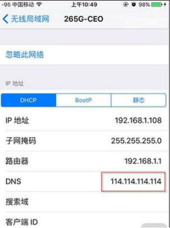 4、找到DNS一栏,删除原来的地址,把114.114.114.114填上去。接下来把AppStore从后台退出,然后再看看是否可以正常使用AppStore应用。