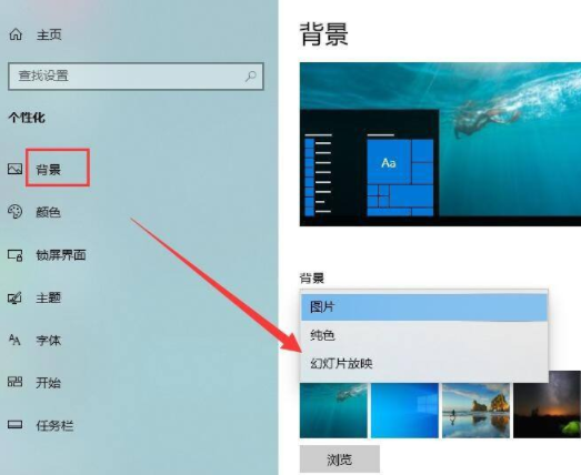 3、在个性化里点击背景,背景处勾选幻灯片设置。