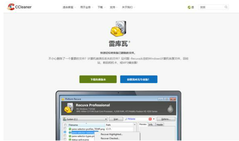 Recuva是一个由Piriform开发的免费数据恢复软件,能够在Microsoft Windows运行。该软件能够恢复被“永久”删除以及被操作系统标示为可用空间的文件。此外,亦能够恢复在快闪设备、存储卡或MP3播放器中被删除的文件。支持的文件系统有FAT12、FAT16、FAT32、exFAT、NTFS、NTFS5、NTFS、EFS、ext2、ext3、ext4。