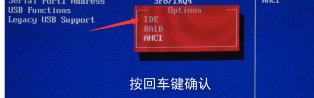 3、弹出"options"窗口,选择”IDE"回车确认,然后按F10保存设置,重新启动即可。
